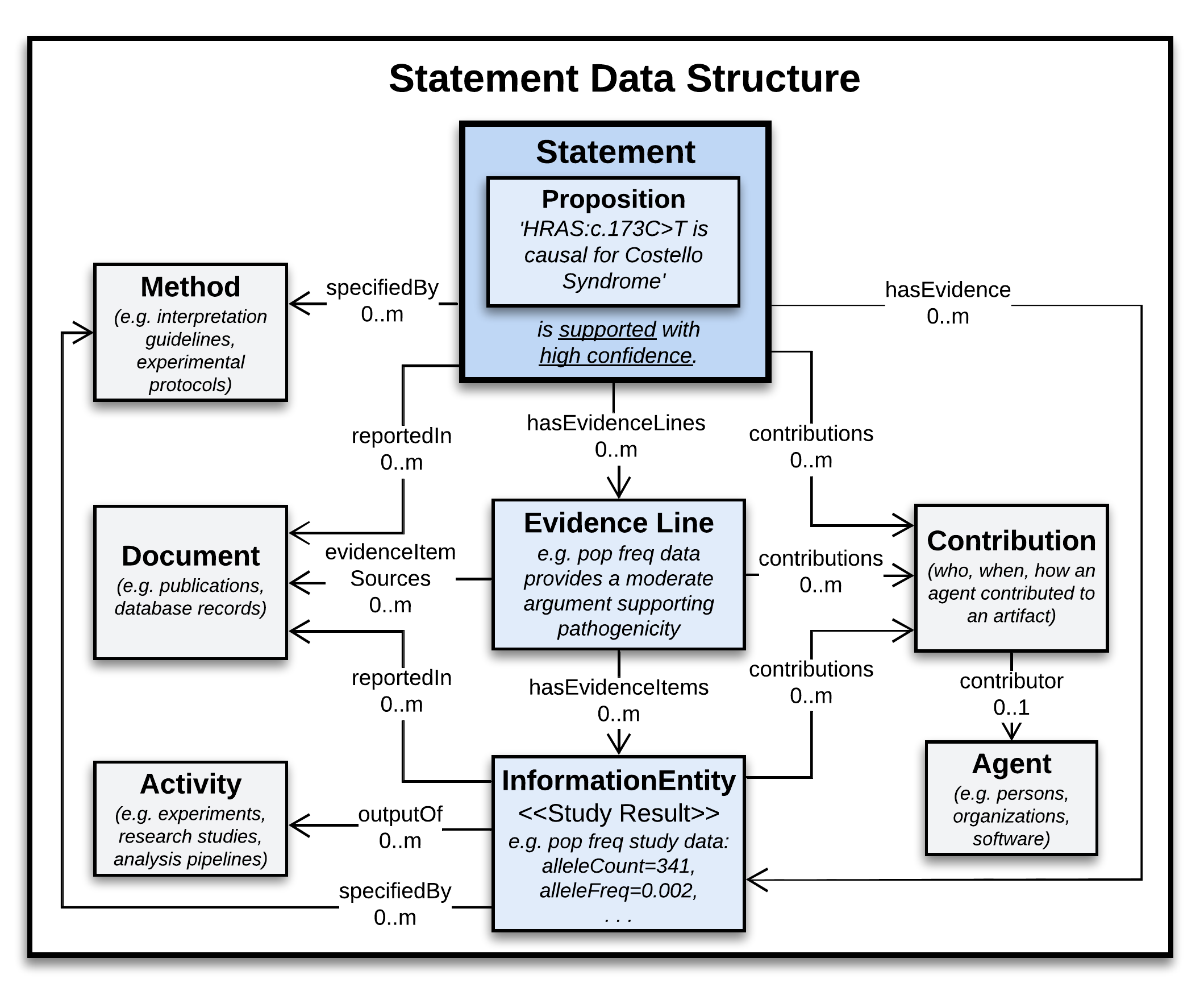 Statements represent assertions or assessments of general knowledge about a variant - e.g. an assertion that ‘HRAS:c.173C>T is pathogenic for Costello Syndrome, or an assessment that there is presently only moderate evidence supporting this possible fact.